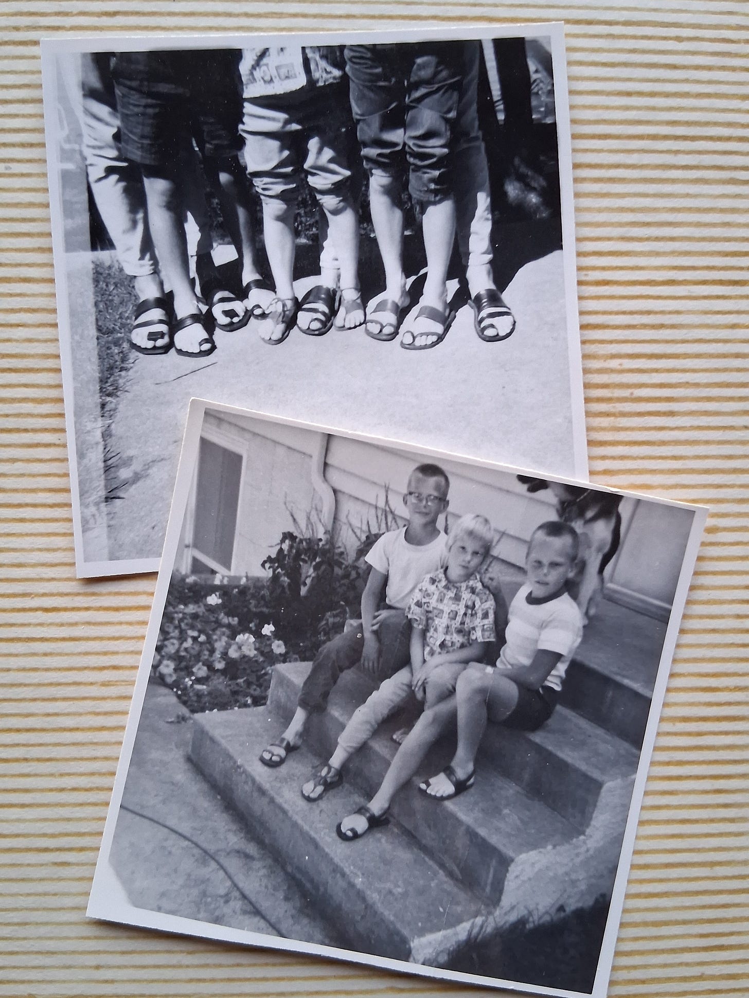 And here are the real deal pics of Uncle John’s homemade sandals from 1964 when he and Uncle Bernhart drove from California to Minnesota in a little Karmann Ghia convertible with poodles Baba and Punch.